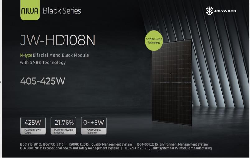 Jolywood 410W Glas-Glas Module, beidseitig verglast für hochwertige Optik und noch effektivere Leistung. Glasmodule mit längerer Lebensdauer und höherem Wirkungsgrad als Standardmodule.